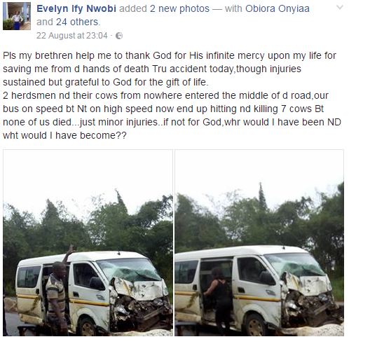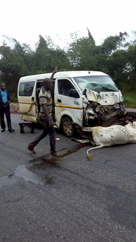 The lady recapped that while she was commuting in a commercial vehicle with other passengers in it, the bus ran into a herd of cattle which caused the death of 7 of the animals but minor injuries on some of the passengers.