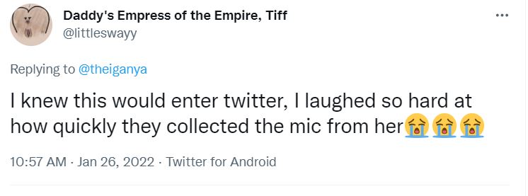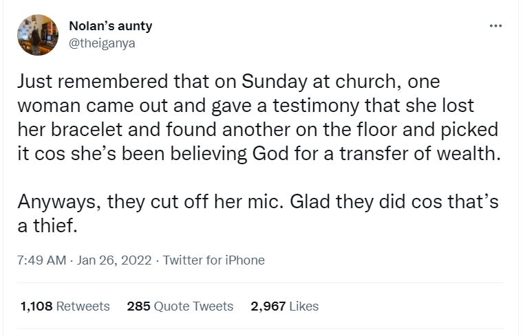 “Just remembered that on Sunday at church, one woman came out and gave a testimony that she lost her bracelet and found another on the floor and picked it cos she’s been believing God for a transfer of wealth. Anyways, they cut off her mic. Glad they did cos that’s a thief.”