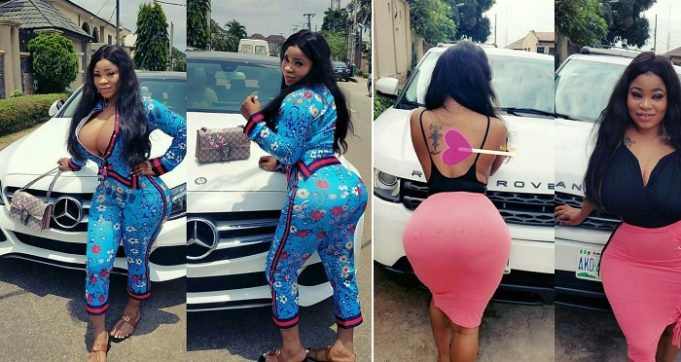 Lagos socialite and Instagram slay queen, Roman goddess, has in new posts on her page showed off her White exotic cars, not leaving out her massive bosom.