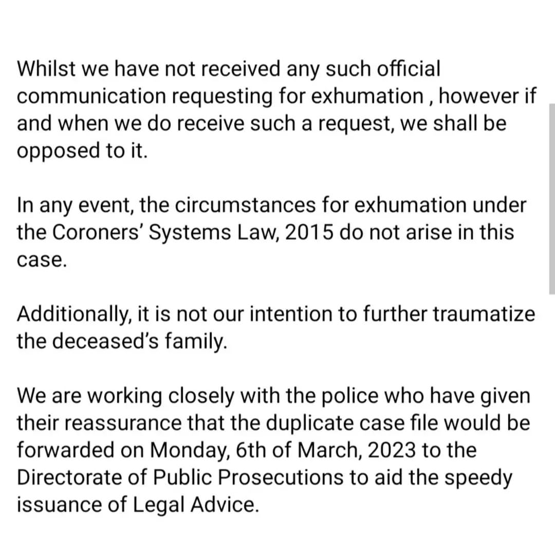 Whilst we have not received any such official communication requesting for exhumation, however if and when we do receive such a request, we shall be opposed to it.