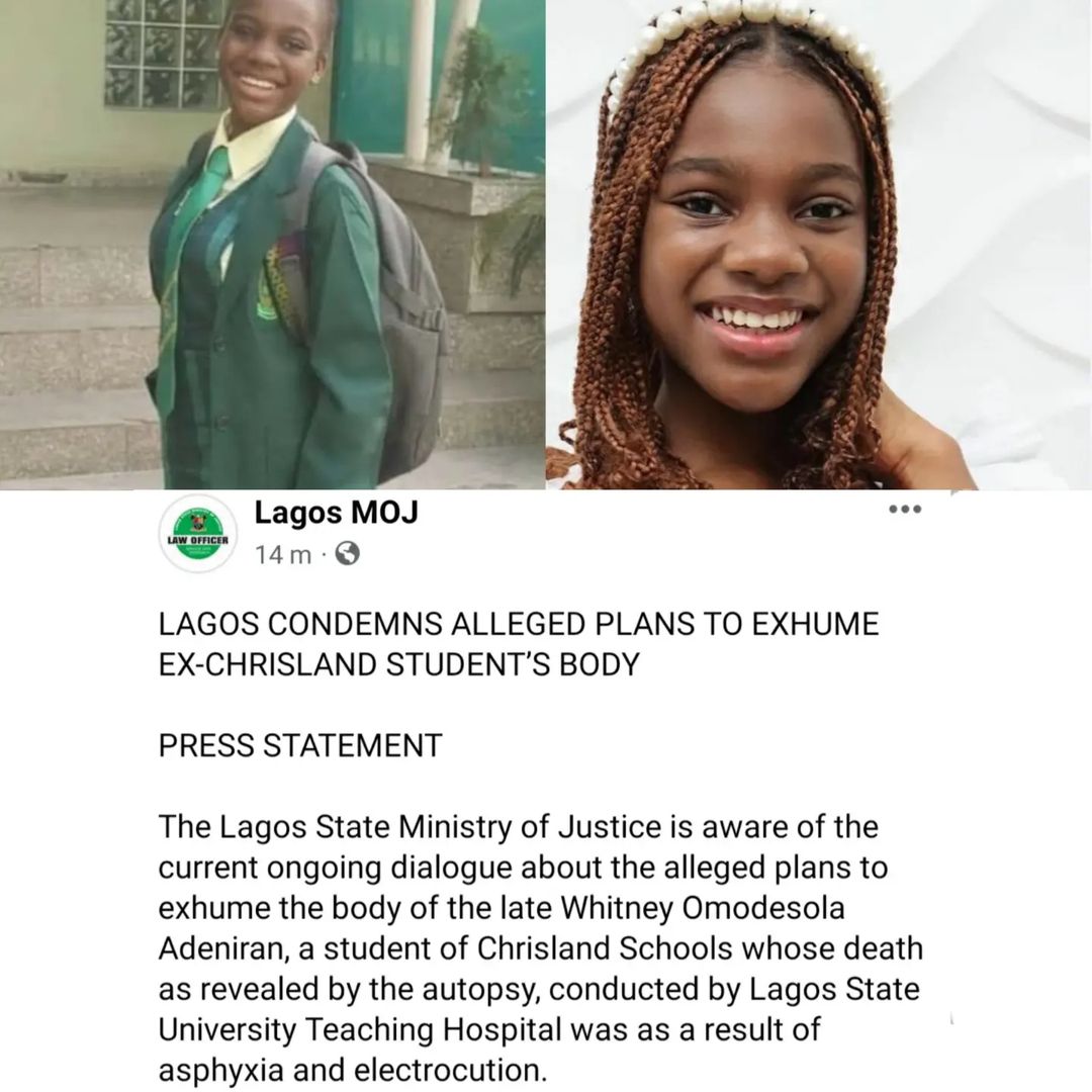 The Lagos state government has denounced alleged intentions to exhume the corpse of Whitney Adeniran, the Chrisland student who was electrocuted while participating in inter-house competitions at her school.