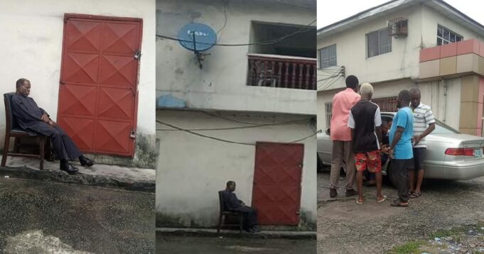 A social media user, Stephen Momoh took to his page to share photos of the closure showing the landlord sitting in front of the red padlocked door.