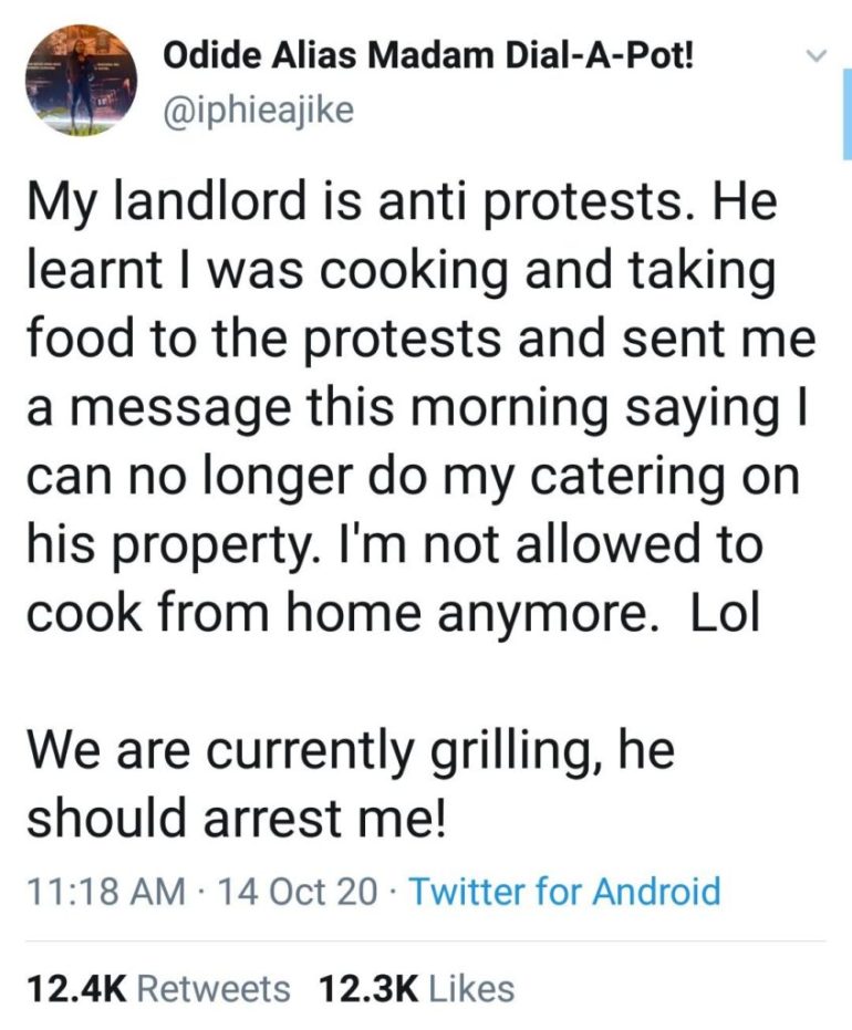 A Nigerian lady known as lphie narrated how her landlord warned her to stop cooking on his compound because she was cooking for the EndSars protesters.