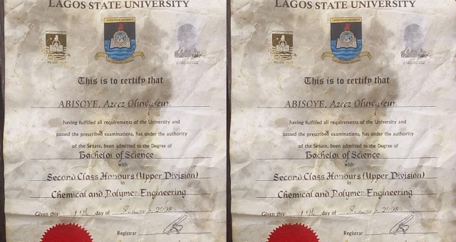 This original certificate belonging to Abisoye, Azeez Oluwaseun, a second-class upper graduate of Chemical and Polymer Engineering, Lagos State University, was found on November 19th at a suya spot in Epe, Lagos state, where it was almost used to wrap suya for a customer.