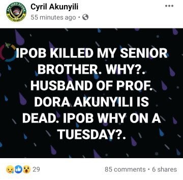 Though details of the incident are still sketchy, a source close to the family said the deceased was still at the University of Nigeria Nsukka Alumni Association (UNAA) where the late Dora was honoured some hours before he was killed.
