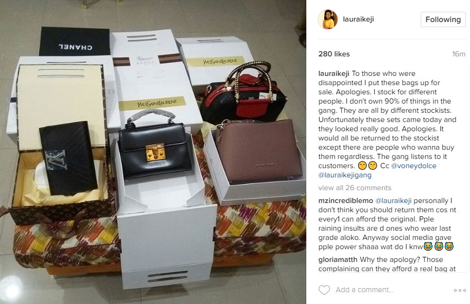 Newly wedded fashion blogger, Laura Ikeji “Kanu”, *we should start getting used to that now* has apologized after she put up fake designer handbags for sale in her shop on her Instagram page.
