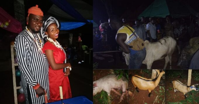 A Nigerian groom who hails from Benue state, Prince Aondona Ornguga took to his Facebook page to show off the livestock he presented to his wife’s family during their traditional wedding held in Enugu.
