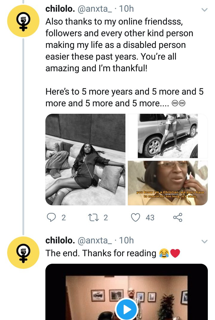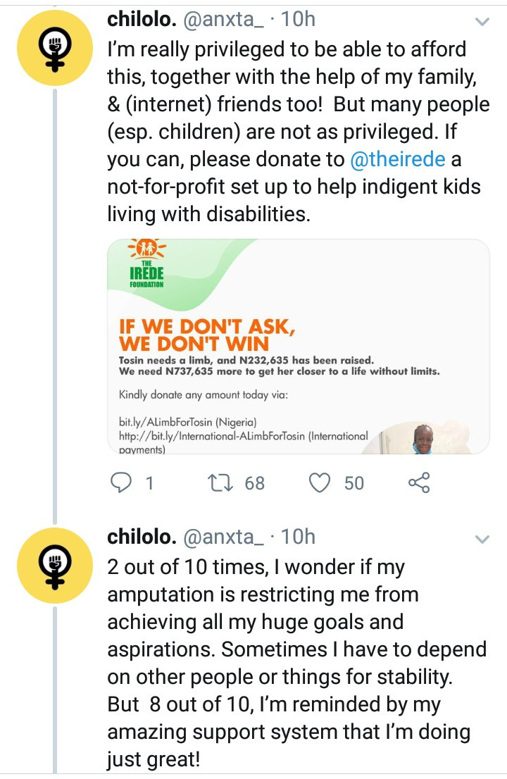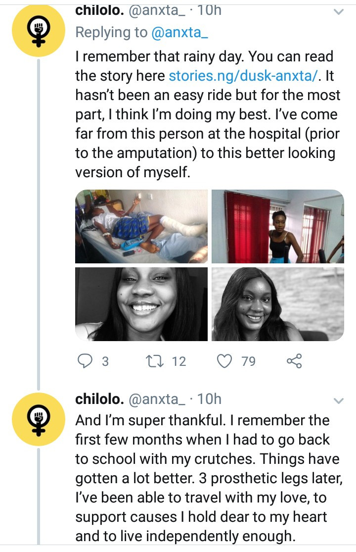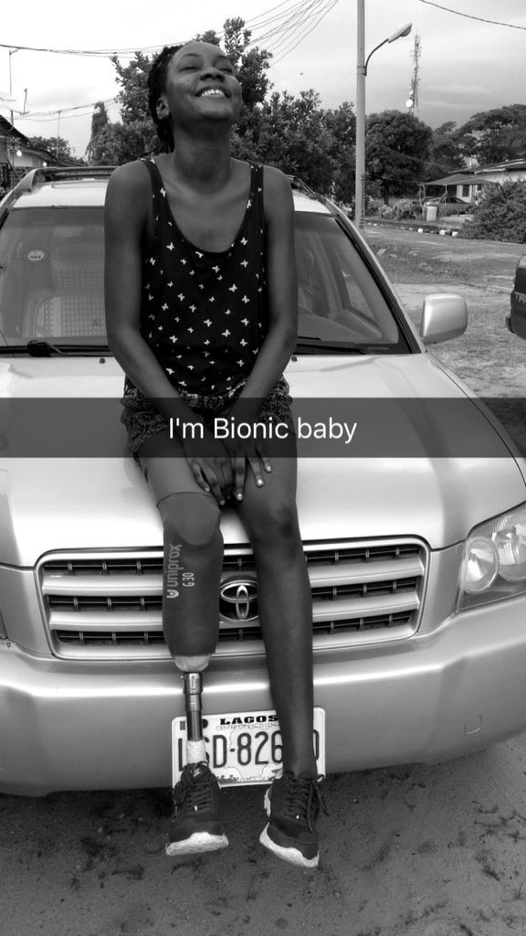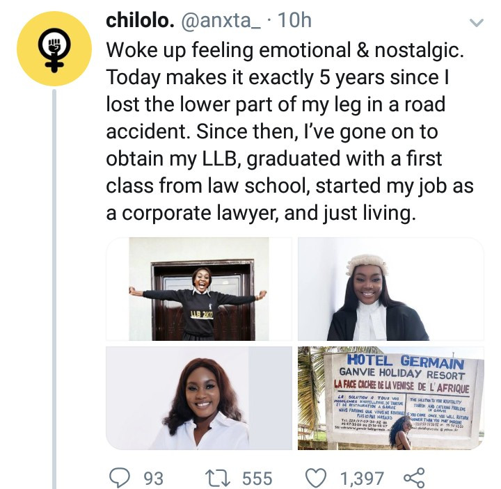 The lady who took to her Twitter page to share, said she was involved in a road accident exactly five years ago — the accident resulted in one of her legs being amputated.