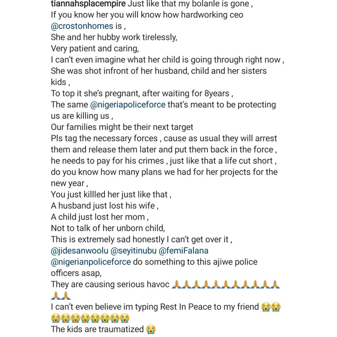 “Just like that my bolanle is gone, If you know her you will know how hardworking ceo @crostonhomes is, She and her hubby work tirelessly, Very patient and caring. I can’t even imagine what her child is going through right now , She was shot in front of her husband, child and her sisters kids. To top it she’s pregnant, after waiting for 8years, The same @nigeriapoliceforce that’s meant to be protecting us are killing us, Our families might be their next target