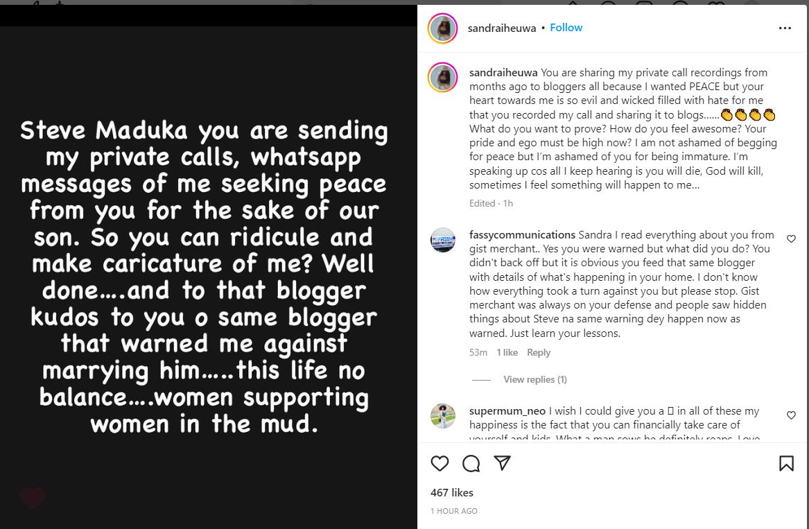 Nigerian businesswoman, Sandra Iheuwa, has been captured in a leaked voice recording making the rounds online begging her estranged husband, Steve Thompson to take her back.