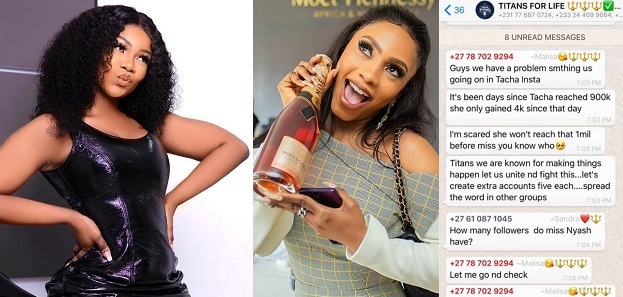 A leaked WhatsApp message from one of the Titan group chat showed members plotting to open 5 IG accounts each to follow Tacha and make sure she gets to the 1 million followers landmark before Mercy!