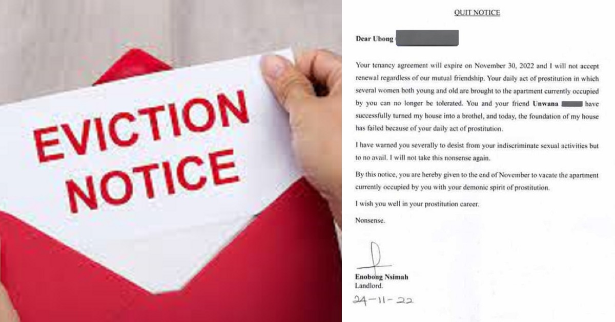 Your tenancy agreement will expire on November 30, 2022 and I will not accept renewal regardless of our mutual friendship. Your daily act of prostitution in which several women both young and old are brought to the apartment currently occupied by you can no longer be tolerated. You and your friend Unwana have successfully turned my house into a brothel, and today, the foundation of my house has failed because of your daily act of prostitution.