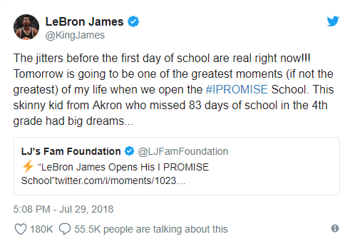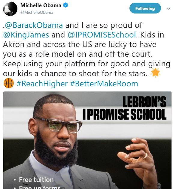 Reacting to the opening of the school, Michelle wrote: “@BarackObama and I are so proud of @KingJames and @IPROMISESchool. Kids in Akron and across the US are lucky to have you as a role model on and off the court. Keep using your platform for good and giving our kids a chance to shoot for the stars. ?? #ReachHigher #BetterMakeRoom”