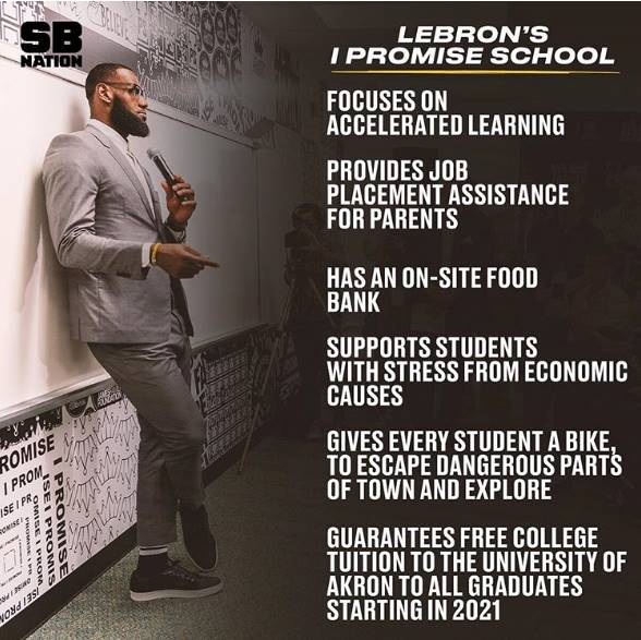 Lebron has done a lot to give back to his community but the I Promise School will be King James’ crown jewel. The 240-person population of third- and fourth-graders is made up of students “identified by Akron Public Schools as behind in critical academic areas and other factors.”