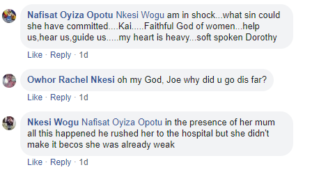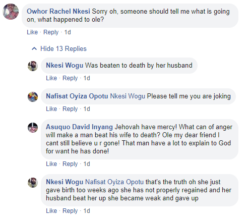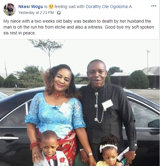 “My niece with a two weeks old baby was beaten to death by her husband the man is oh the run his from etche and also a witness. Good bye my soft spoken sis rest in peace”