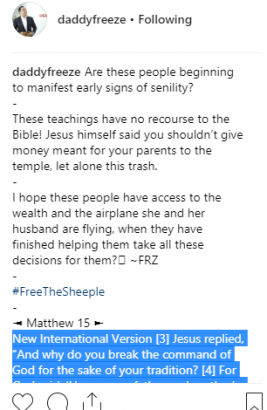 “These teachings have no recourse to the Bible! Jesus himself said you shouldn’t give money meant for your parents to the temple, let alone this trash.