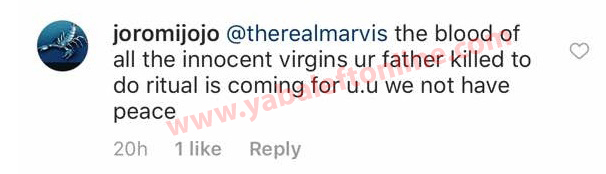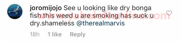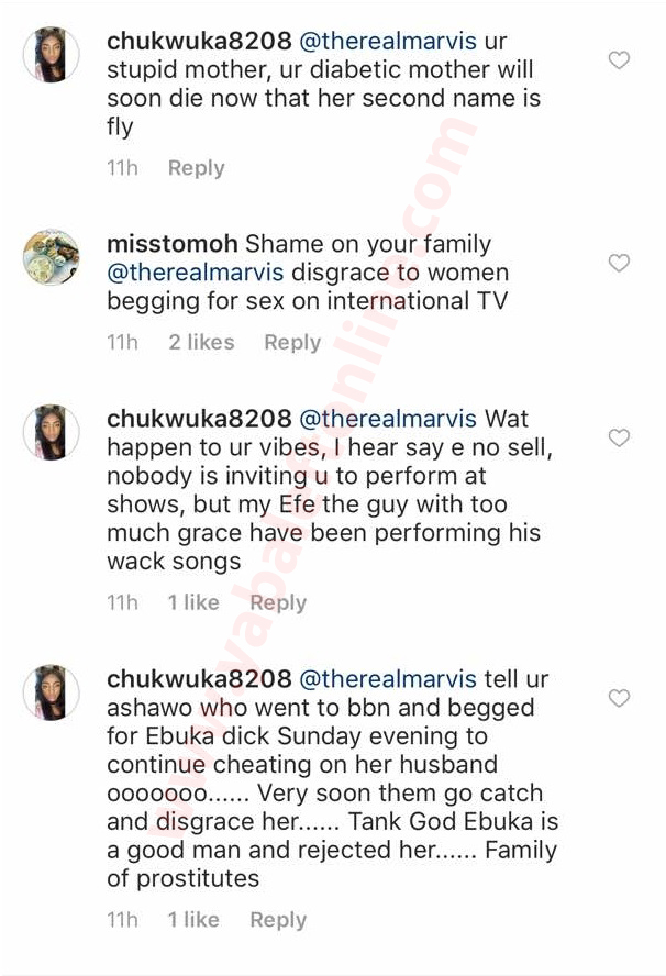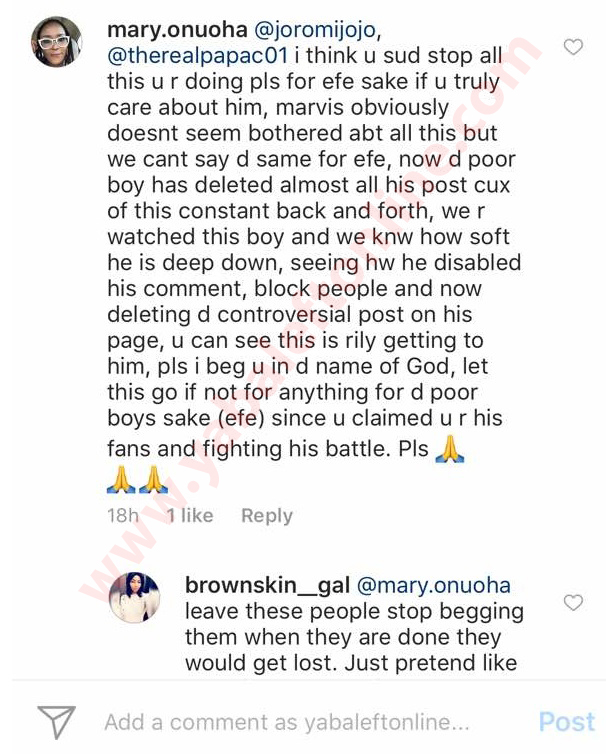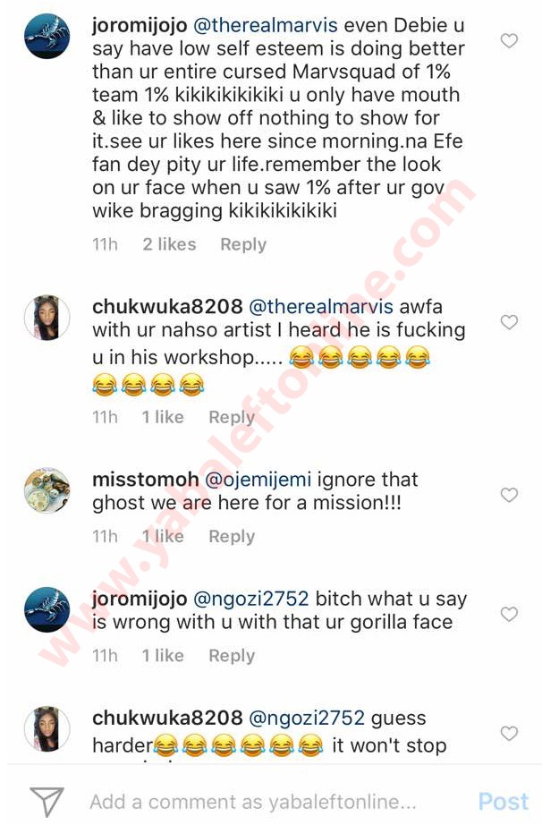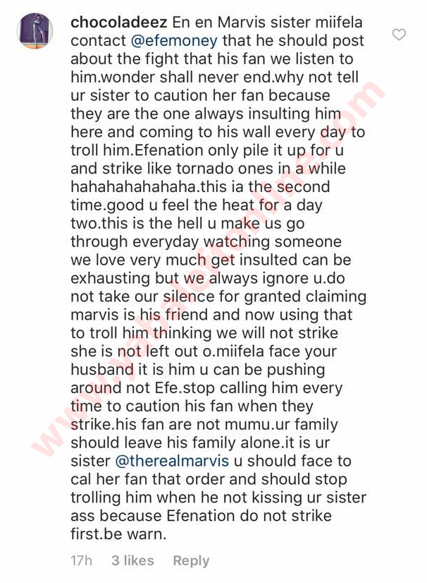 According to what can also be deduced from the comment section, the brawl started when some Marvis fans took to Efe’s page to blast him and all and so in retaliation, the Based on Logistics’ crooner’s fan stormed Marvis page to return the favour.