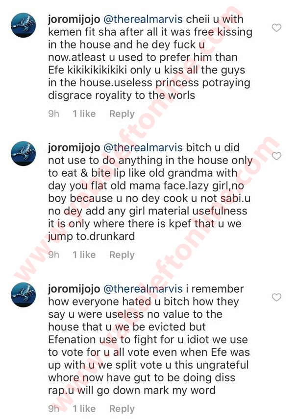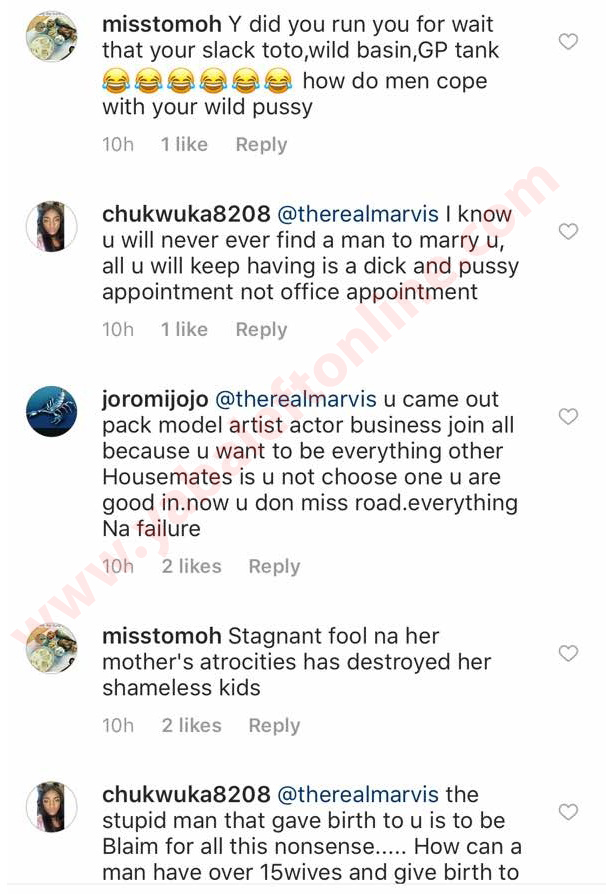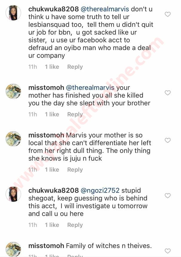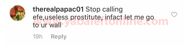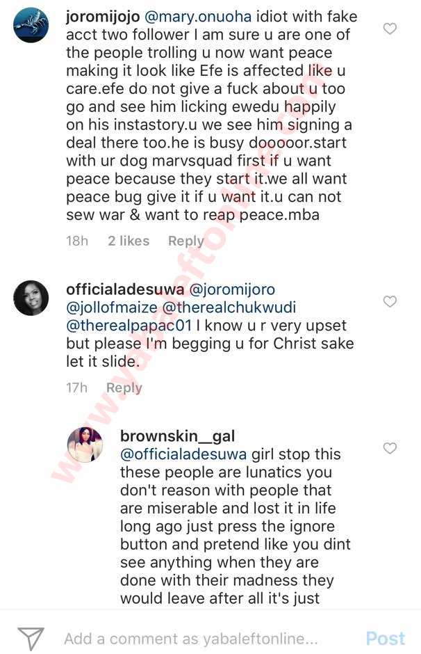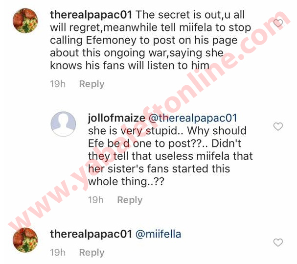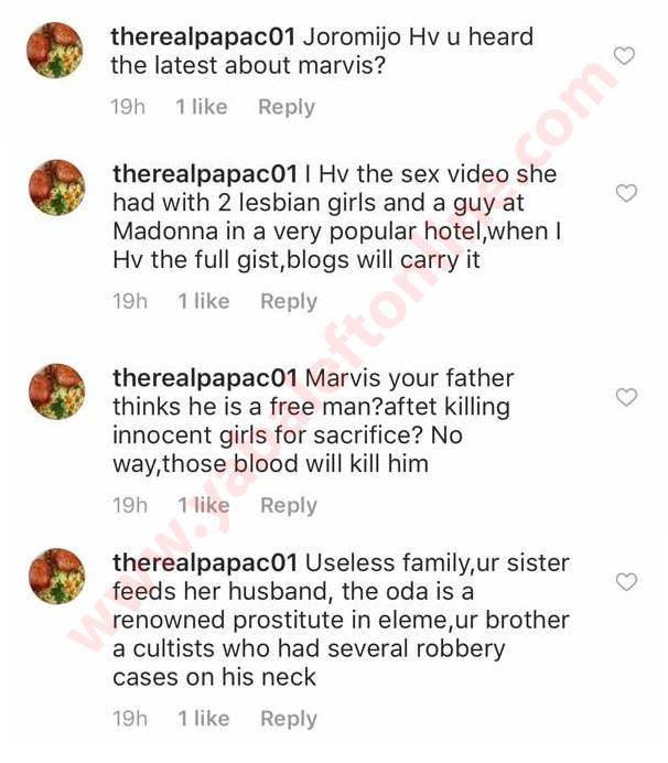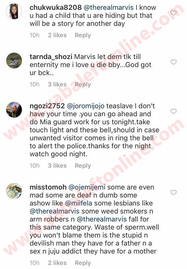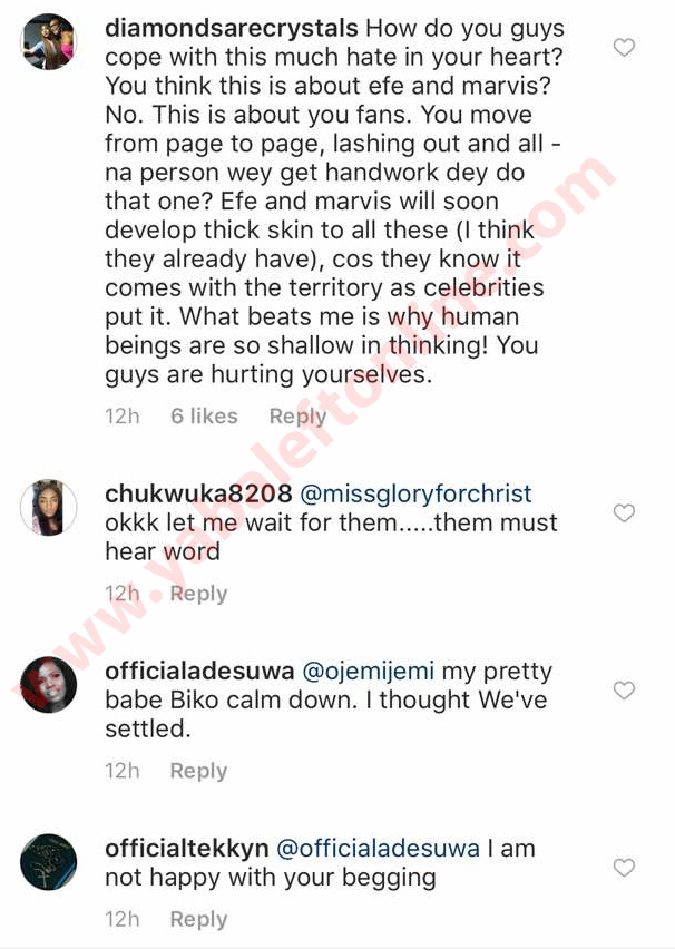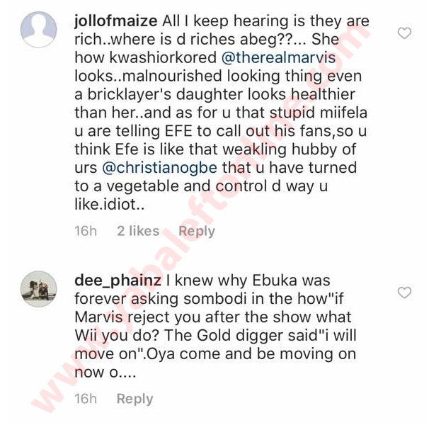 Efe Fans already turned Marvis page to a war zone, with many calling her series of names.. Most of the allegations there, are lesbianism claims, ritual claims, abortion claims.
