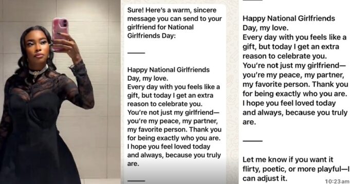 A Nigerian lady is getting attention online after posting the message her boyfriend sent her for Girlfriend’s Day and revealing that AI wrote it.