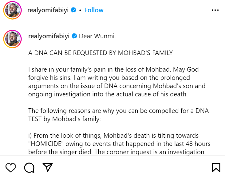 I share in your family’s pain in the loss of Mohbad. May God forgive his sins. I am writing you based on the prolonged arguments on the issue of DNA concerning Mohbad’s son and ongoing investigation into the actual cause of his death.