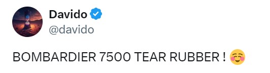 The singer also confirmed the information via a tweet on his page, on the microblogging platform X, which said; “BOMBARDIER 7500 TEAR RUBBER!”