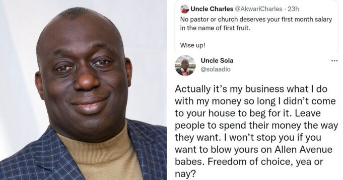 Nigerian life coach, Sola Adio, has replied a man who said no pastor deserves one’s first month salary in the name of first fruit.
