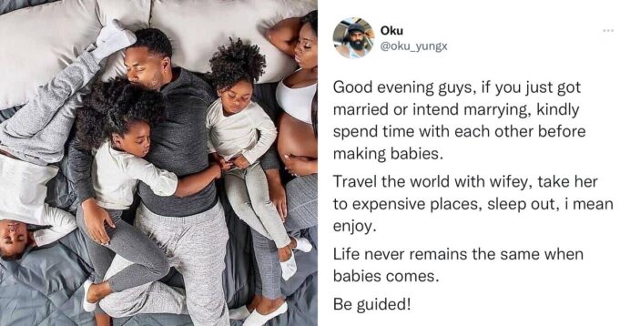 A Nigerian man has taken to the micro-blogging platform, Twitter, to advise couples who just got married to not be in a haste to have babies.
