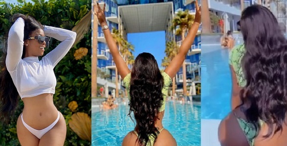 The Ebony beauty took to Instagram to share photos and videos of herself inside the swimming pool of the hotel where she is lodged.