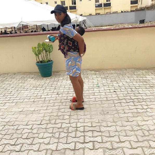 So it looks like the actress is enjoying motherhood as she shared this overly adorable photo of her son strapped to her back, and saying she’s loving every minute of being a proud super mom.