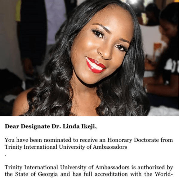“I told you guys a few months ago to call me Princess Linda after the Arewa Youths title, but after August 8th, you will have to upgrade that to Dr. Linda Ikeji…. I’m getting a honorary doctorate degree from Trinity International University of Georgia for my contribution to media in Africa and as Africa’s Most Successful Blogger. . Really grateful to God for how far He’s brought me! And thank you for your congratulations. Love to you and yours..”