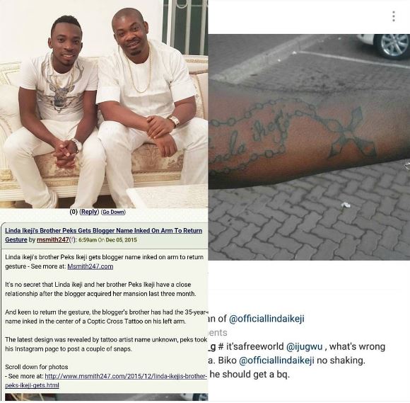 Brother of celebrity blogger, Linda Ikeji, Peks Ikeji, who has always been a subject of ridicule on Social media because of his quite pompous attitude, was alleged by a Nairaland post to have a tattoo of his sister’s name on his arms as seen above.