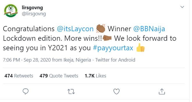 The Lagos State Internal Revenue Service, LIRS, has sent a congratulatory message to BBNaija: Lockdown winner, Laycon, which includes a point about his tax.