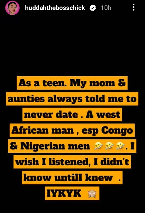Taking to her Instastory, the 30-year-old reality show star said she was advised against dating West African men, especially Nigerian and Congolese men, but their advice fell on deaf ears.