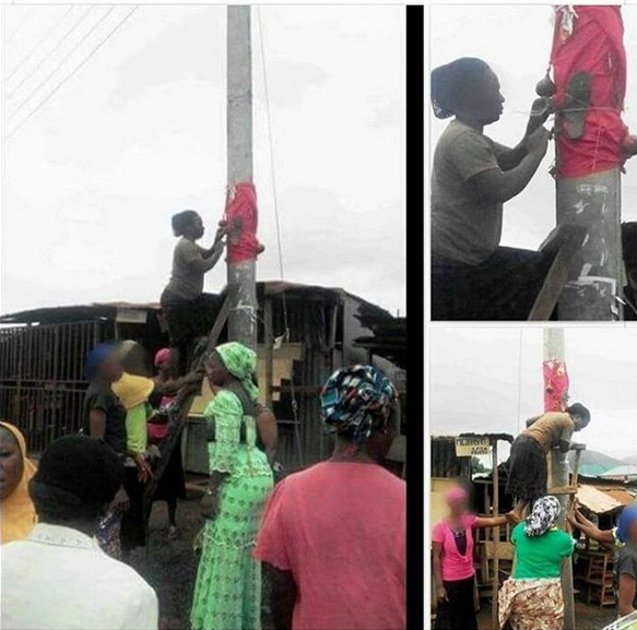 This group of women were spotted tying what seems like voodoo, ‘Jazz’, as it’s fondly called, to a NEPA pole and it’s only speculated that they carried out the act so as to scare away the PHCN officials.