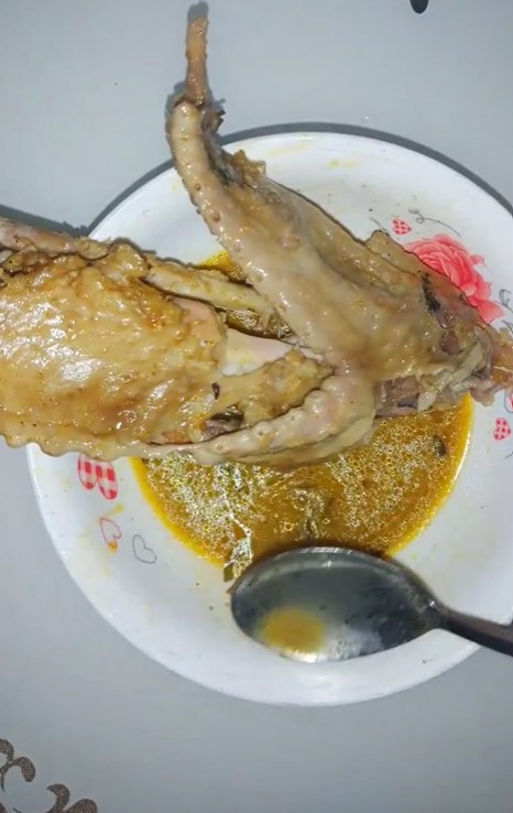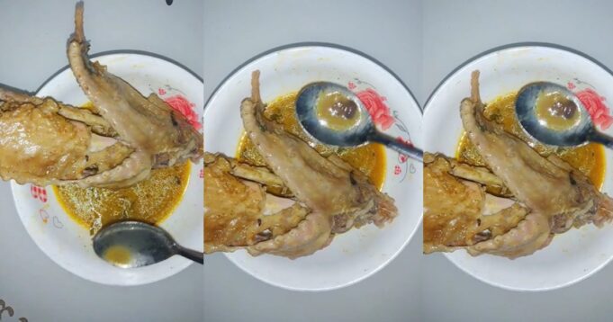 In the viral video, the lady explained that after consuming a spoonful of the pepper soup, she noticed something was different about the taste, hence, she poured it into a bowl. She expressed shock when she saw locust beans swimming in the chicken pepper soup.