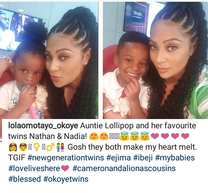 Singer, Peter Okoye’s wife, Lola Omotayo recently took to her social media page to share photos taken with Anita and Paul Okoye’s twins – Nathan and Nadia Okoye.