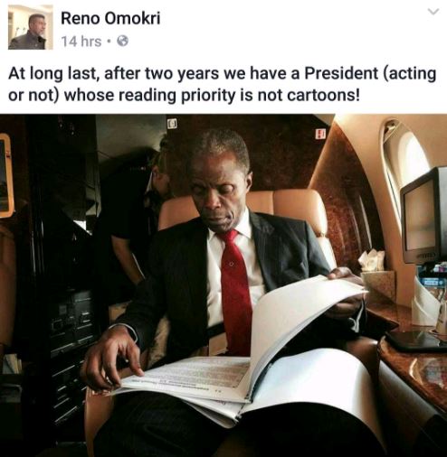 The Nigerian author, took to his Facebook page hours ago to shade the ill president. He wrote alongside a photo of the acting President, Yemi Osinbajo,