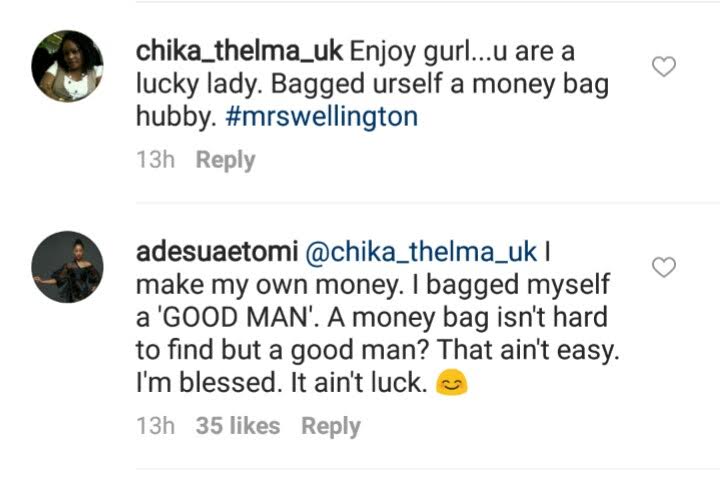 Meanwhile, Adesua Etomi gave an epic reply to a fan who said she bagged herself a money bag for a husband. The fan wrote: āEnjoy gurl⦠u are a lucky lady. Bagged yourself a money bag hubby. #mrswellington,ā