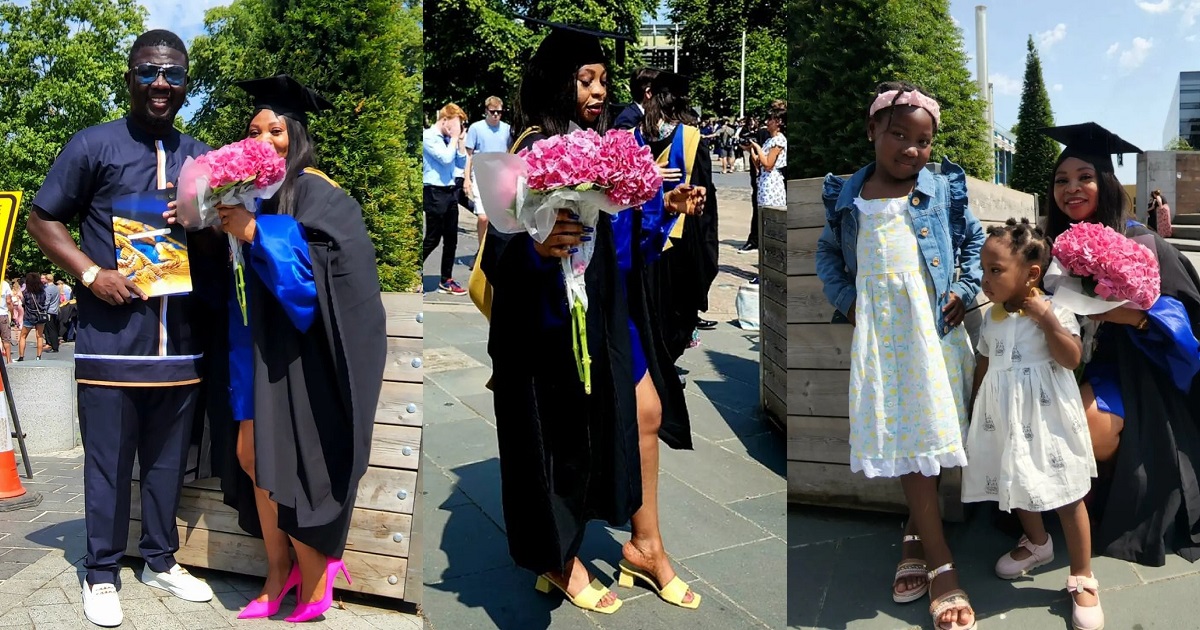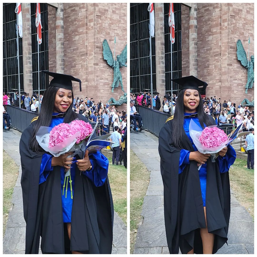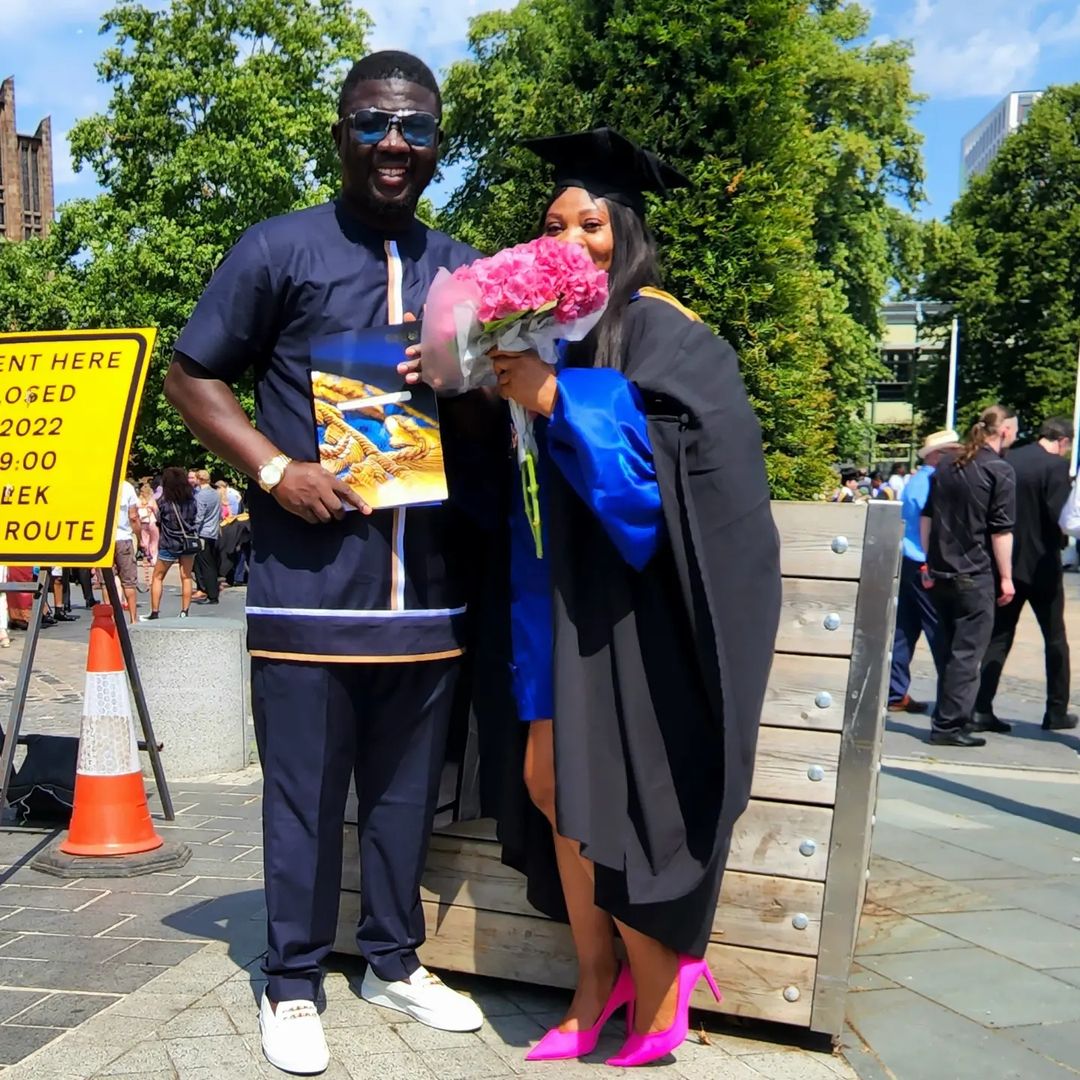 The overjoyed husband took to Instagram moments ago to congratulate his wife, Mercy Stacy Ebere, on her graduation from the prestigious Coventry University in the United Kingdom.
