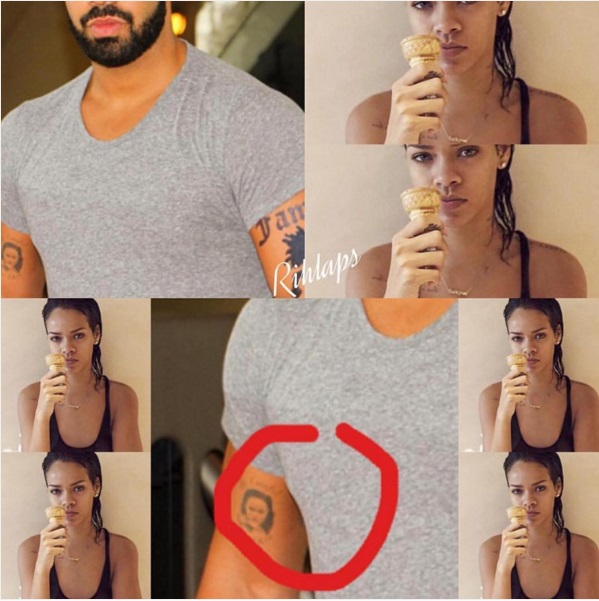 Below are pictures of a Rihanna tattoo Drake got on his right arm last year. It’s been more than one year or so since he got the ink, but fans are just noticing that it’s actually Rihanna’s face!