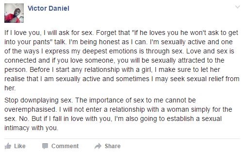 But this Facebook user, Victor Daniel, has taken to his page to oppose the motion, as he says, if he actually loves a girl, he’d definitely ask for sex cause “love and sex is connected“.