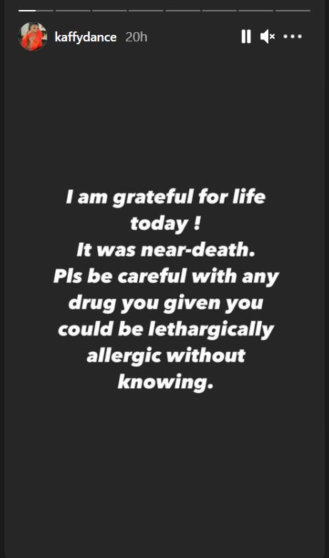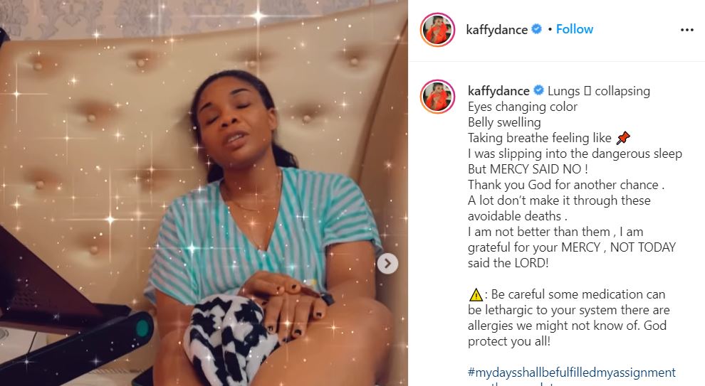 Nigerian professional dancer, Kaffy has taken to social media to express gratitude to God for sparing her life after she suffered drug allergy.