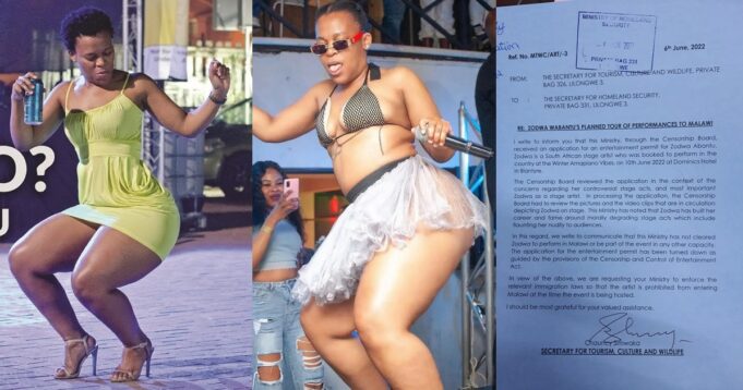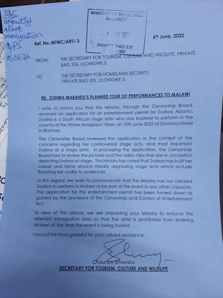 In a letter dated June 6 and addressed to the Secretary for Homeland Security from the Secretary for Tourism, Culture and Wildlife, the Ministry made it clear that it has not cleared Zodwa Wabantu to perform in Malawi or be part of an event in any other capacity and that the application for the entertainment permit has been turned down as guided by the provisions of the Censorship and Control of Entertainment Act.