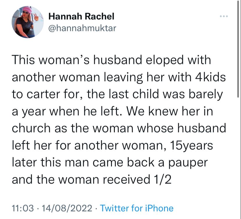 A Twitter user, identified as @hannahmuktar, has taken to the micro-blogging platform to narrate how a man abandoned his wife and four children for another woman.