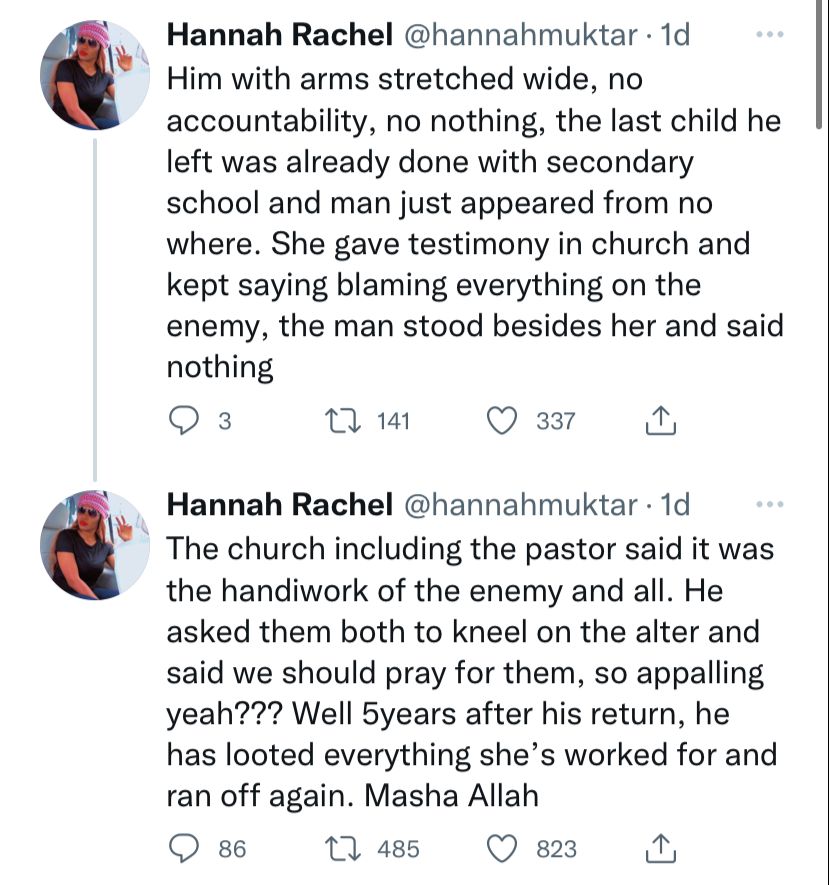 The church including the pastor said it was the handiwork of the enemy and all. He asked them both to kneel on the alter and said we should pray for them, so appalling yeah??? Well 5years after his return, he has looted everything she’s worked for and ran off again. Masha Allah.”