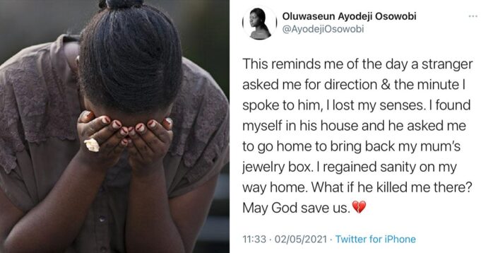 “This reminds me of the day a stranger asked me for direction & the minute I spoke to him, I lost my senses. I found myself in his house and he asked me to go home to bring back my mum’s jewelry box. I regained sanity on my way home. What if he killed me there? May God save us”.