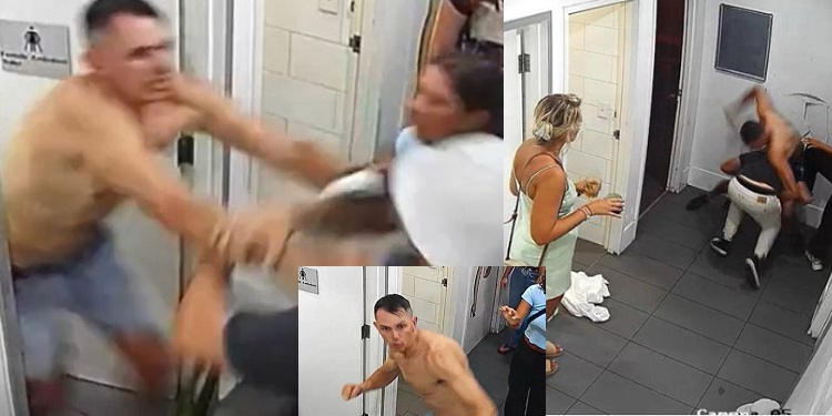CCTV played at the court shows the 28-year-old clubgoer rushing out of the disabled toilet cubicle without a shirt and throwing a flurry of punches at the cleaner, who had been knocking on the door for about three minutes.