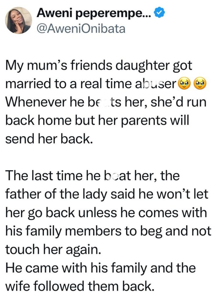This time she came running again, her father insisted she wouldn’t go back until the husband comes with a family member to apologize and guarantee he wouldn’t lay a finger on her anymore.