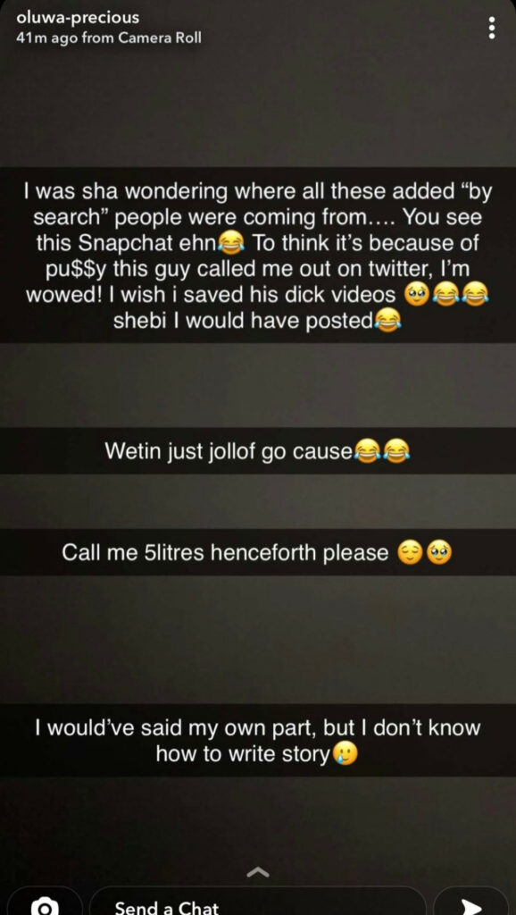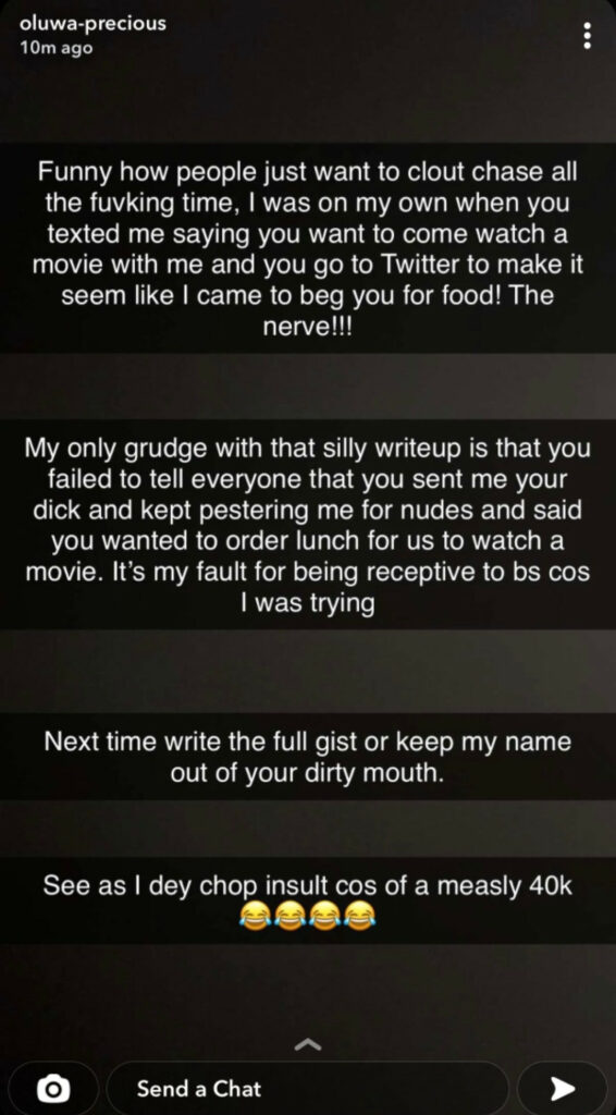 Well, the lady has now taken to Snapchat to respond to his tweet.