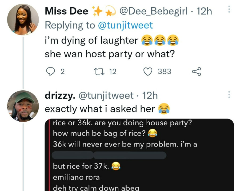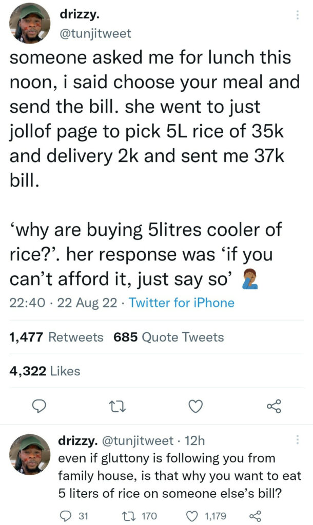 ‘why are buying 5litres cooler of rice?’. her response was ‘if you can’t afford it, just say so’ 🤦🏾‍♂️”